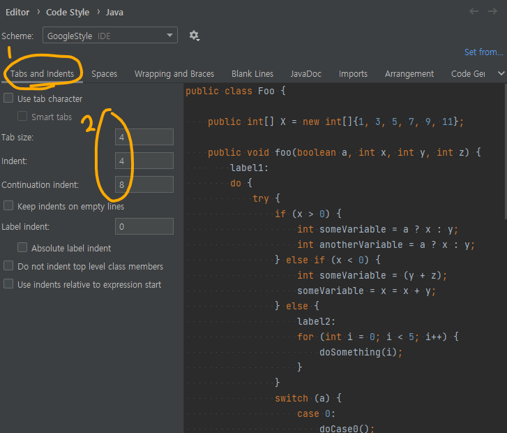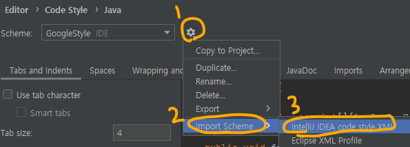 처음 들어가신다면 Scheme 부분이 저처럼 GoogleStyle로 되어있지 않고 Default로 되어있으실 거에요.